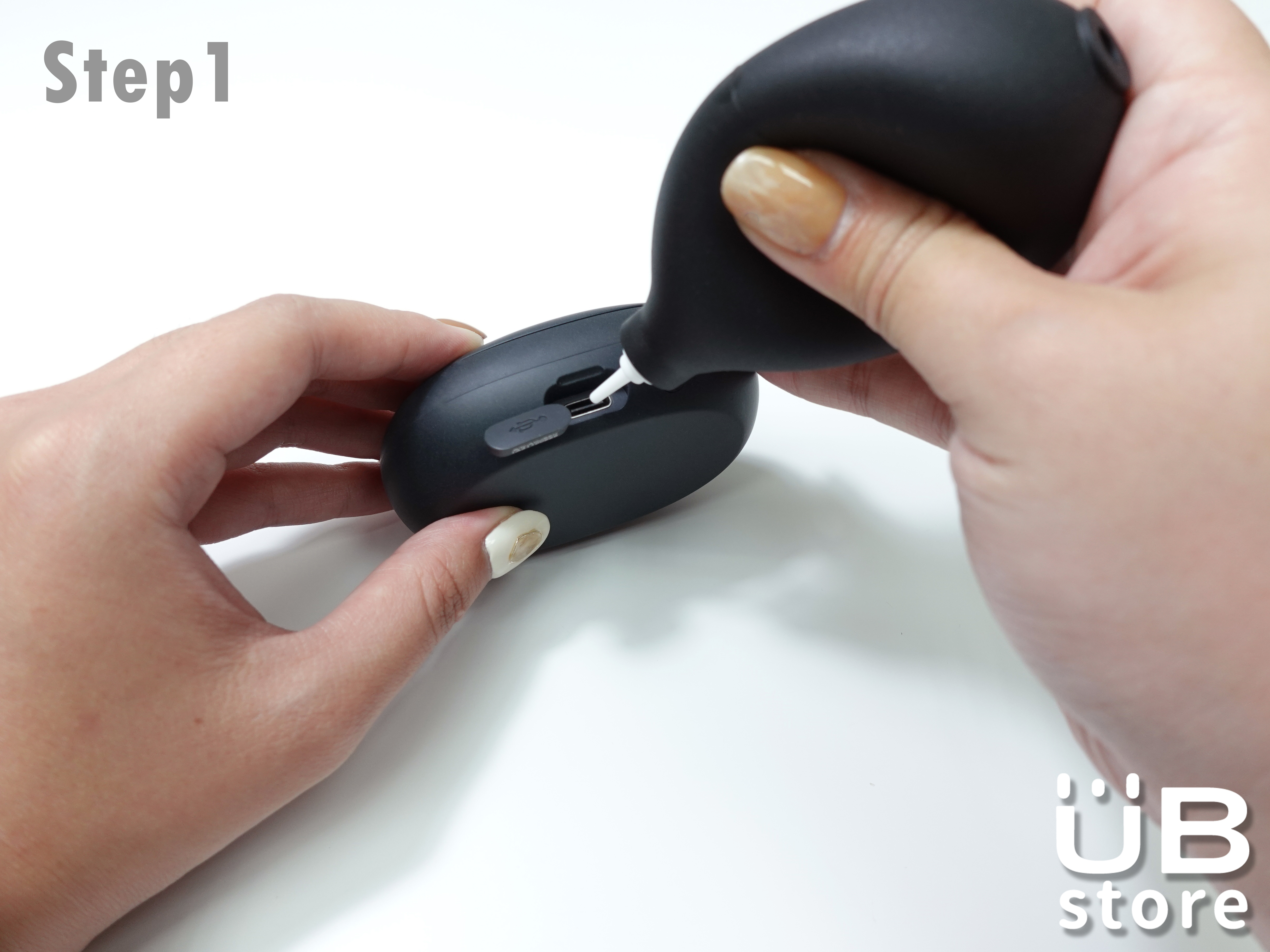 充電盒的充電空容易卡灰塵,有時會導致接觸不良, 這時只要用吹嘴將灰塵吹出即可!