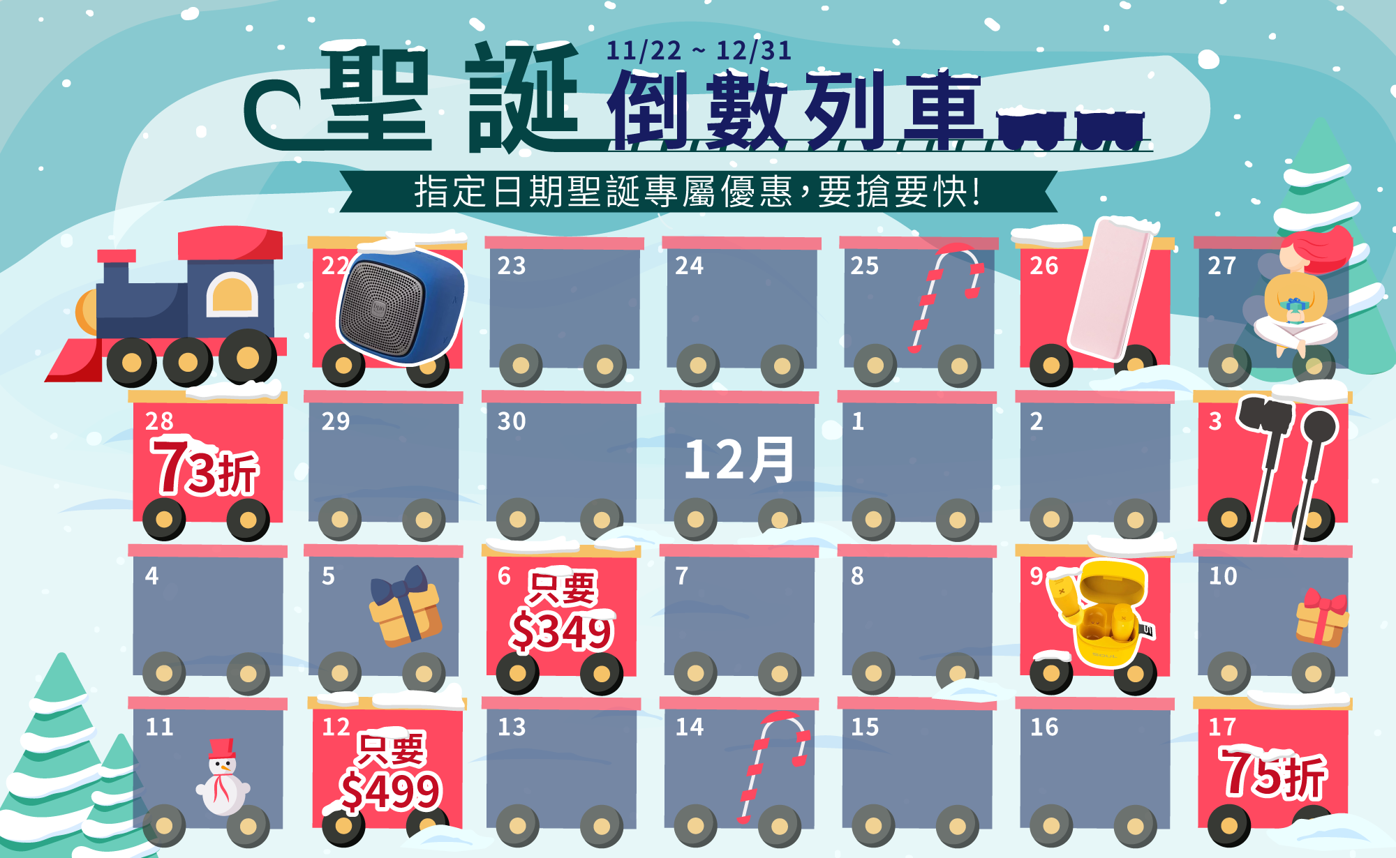 在指定日期會推出,專屬會員的聖誕優惠,不只有買就送,最高還下殺73折,快在優惠日期上網選購,要搶要快!!