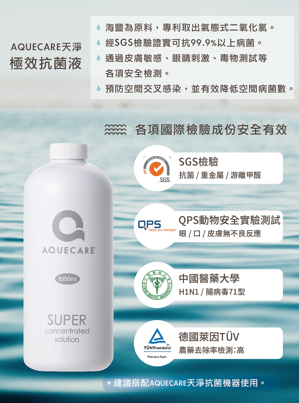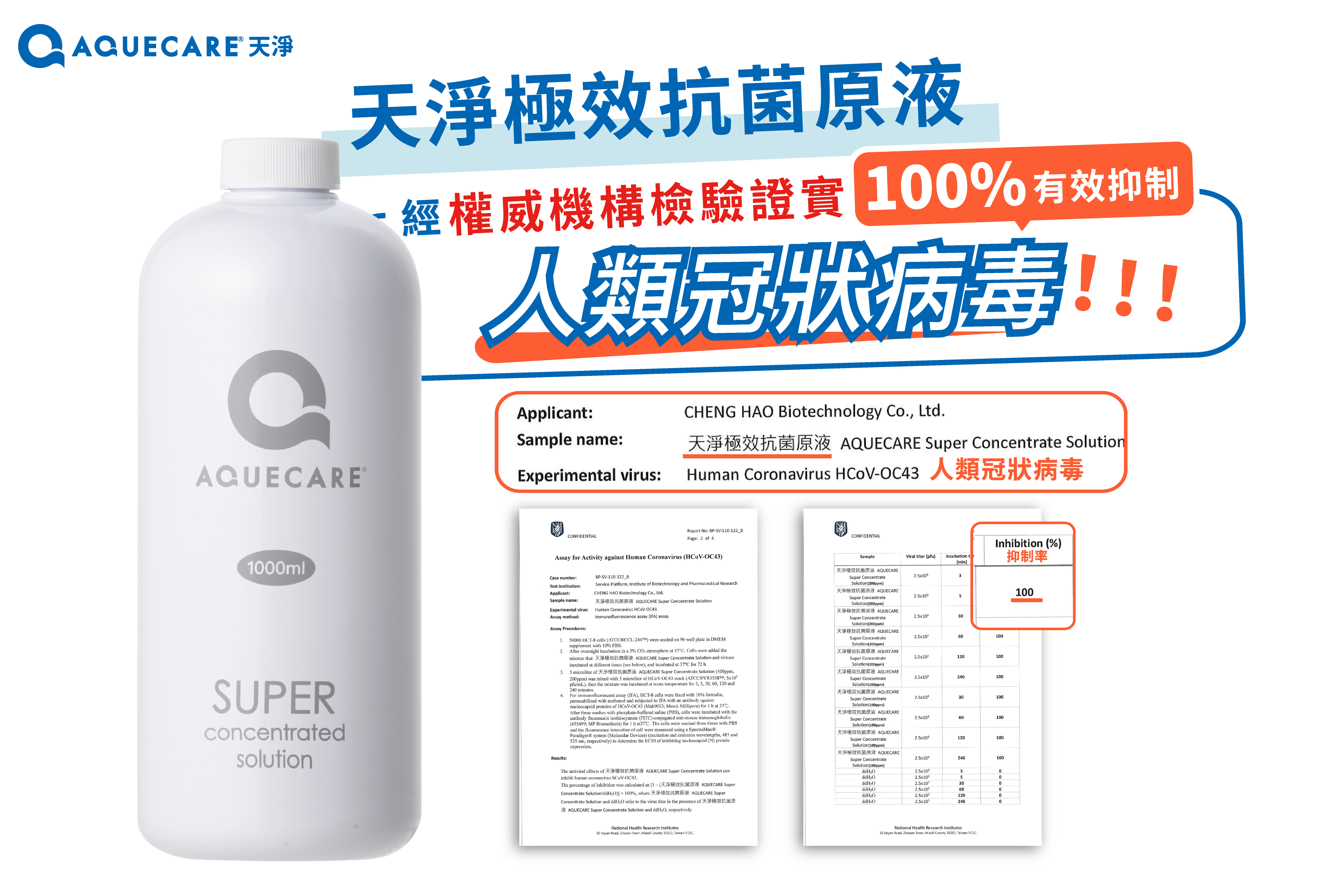 AQUECARE 天淨 極效抗菌源液 經權威機構證實 100%有效抑制 人類冠狀病毒!!