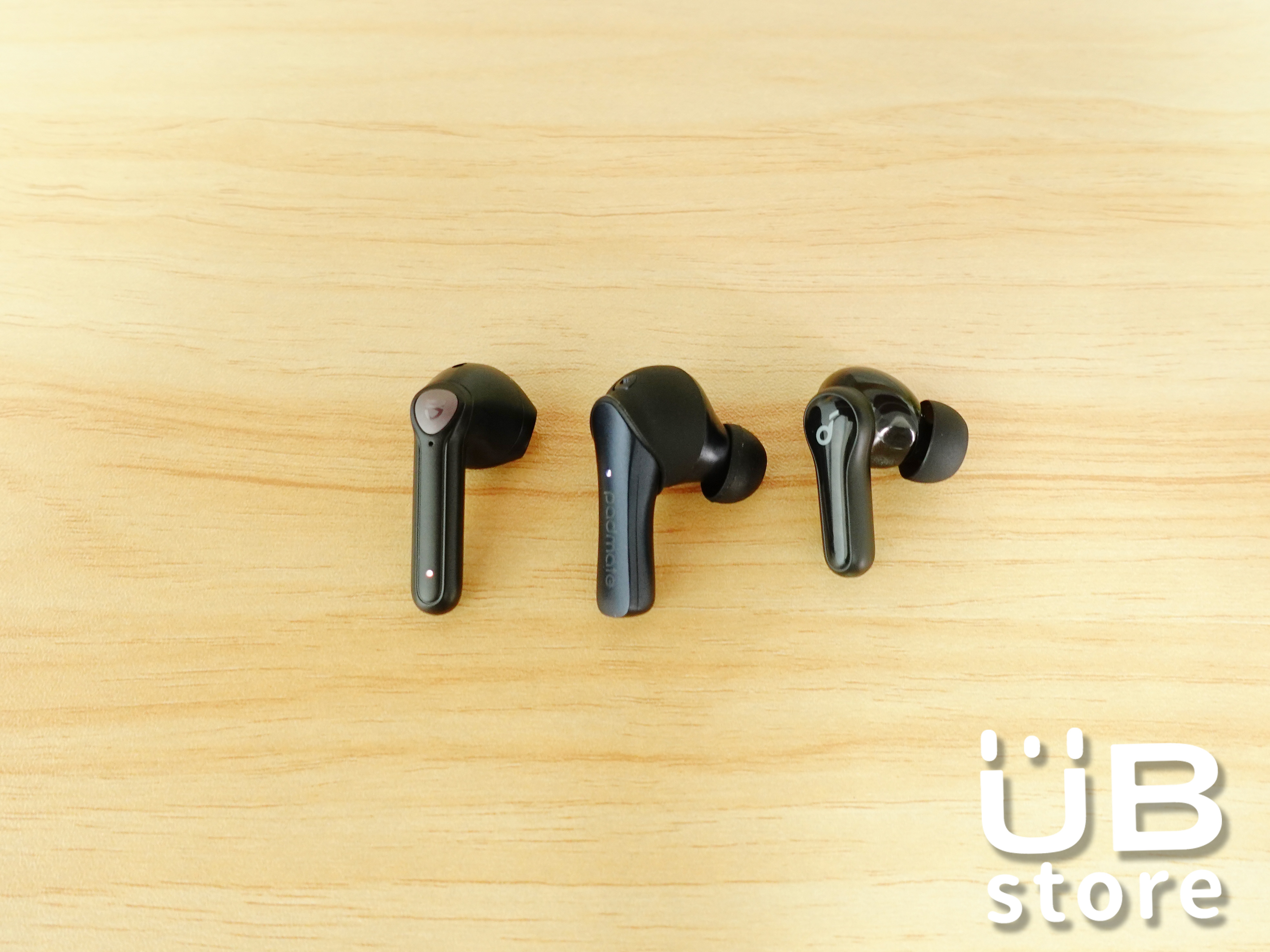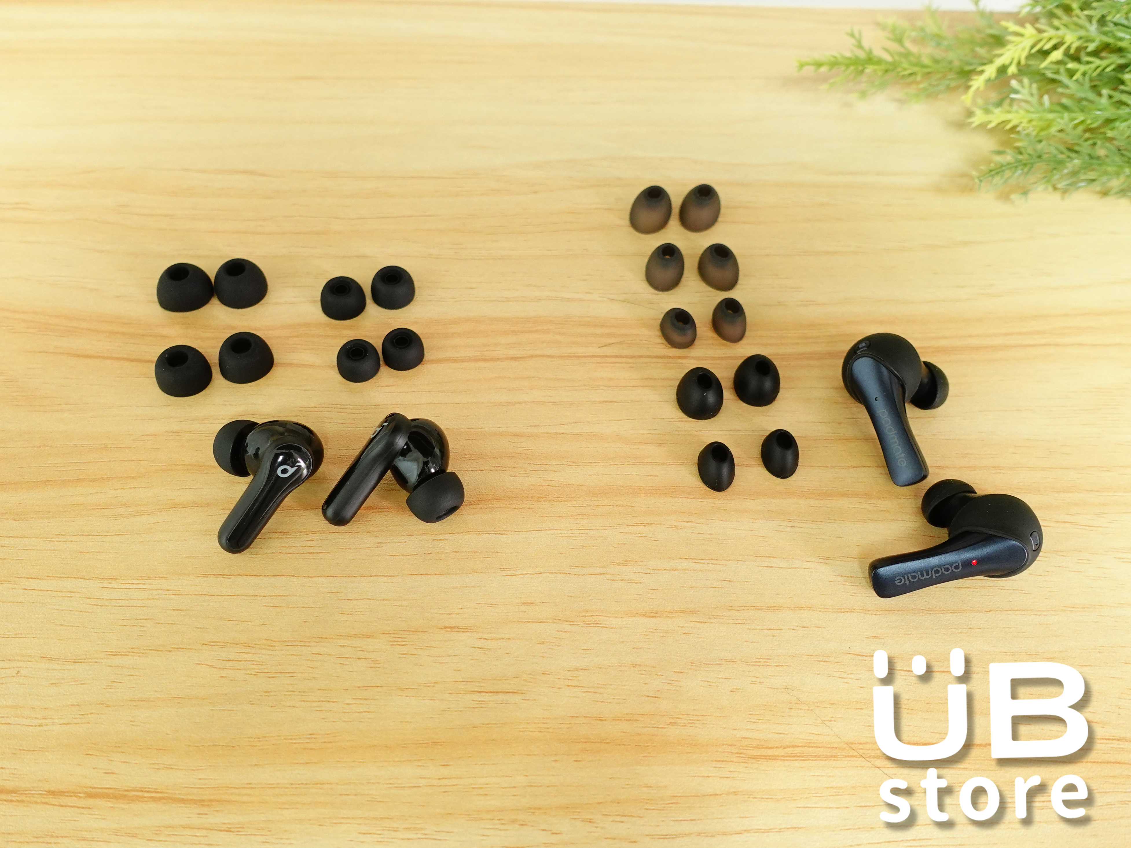 剛好三款都是棒狀指向桿造型,其中 TrueAir2 是半入耳式設計,另外兩款都是入耳式。從指向桿長度來說,Life Note E 比其他兩款更短,造型則跟Apple 的 AirPods Pro 很相似,TrueAir2 則是與AirPods 一、二代很像,都是半入耳式造型,M1 mini 的造型是腔體特別大,上面有做矽膠套防滑,所以有運動需求的人也可以優先考量這款。