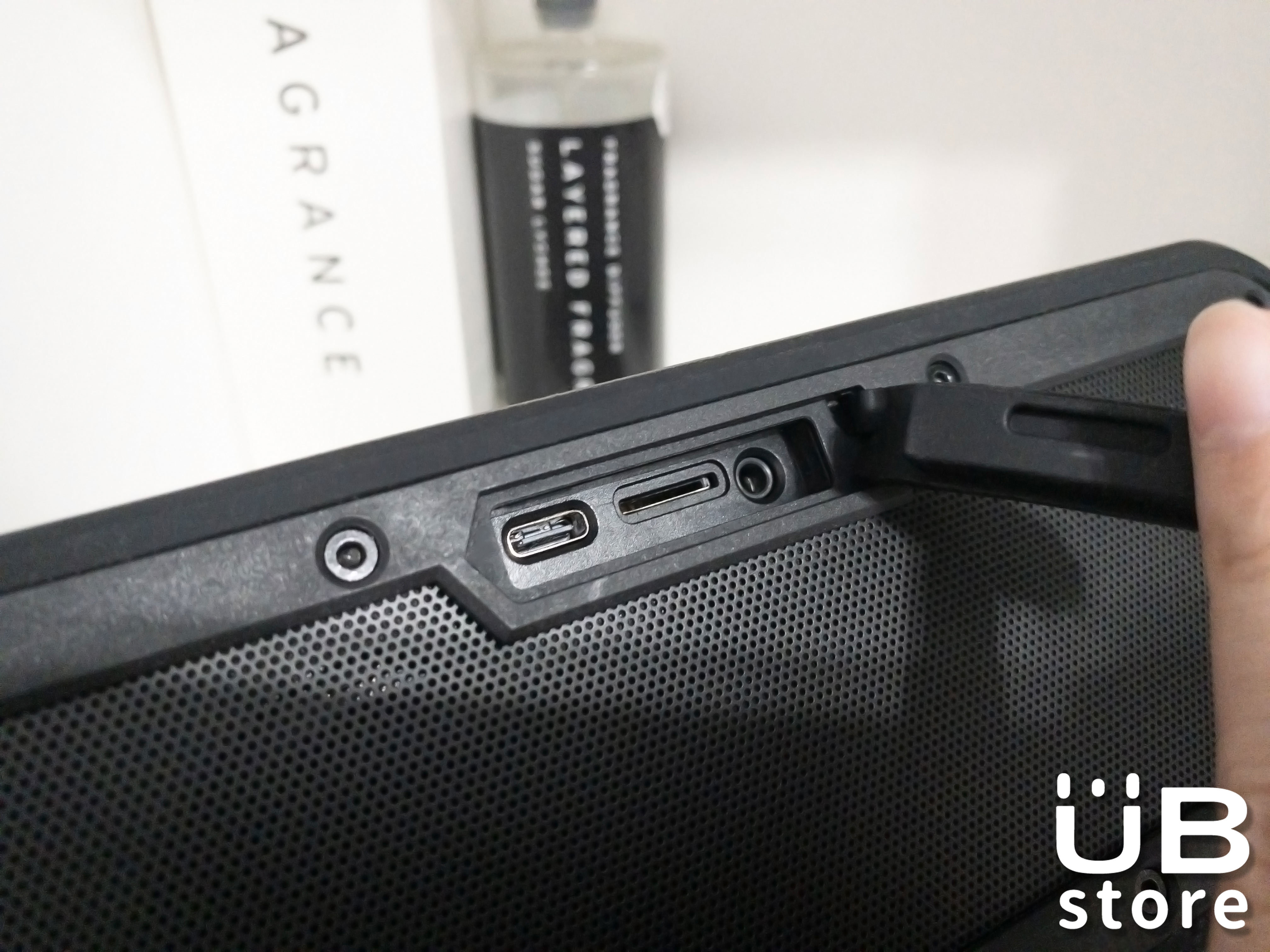 而插孔做在後方的矽膠蓋內,分別為Type-C充電孔,支援32GB TF記憶卡與AUX IN(3.5mm)。而這個矽膠蓋非常厚實,千萬要記得壓緊蓋好,否則再怎麼防水,若水從此跑進去,可就GG了。