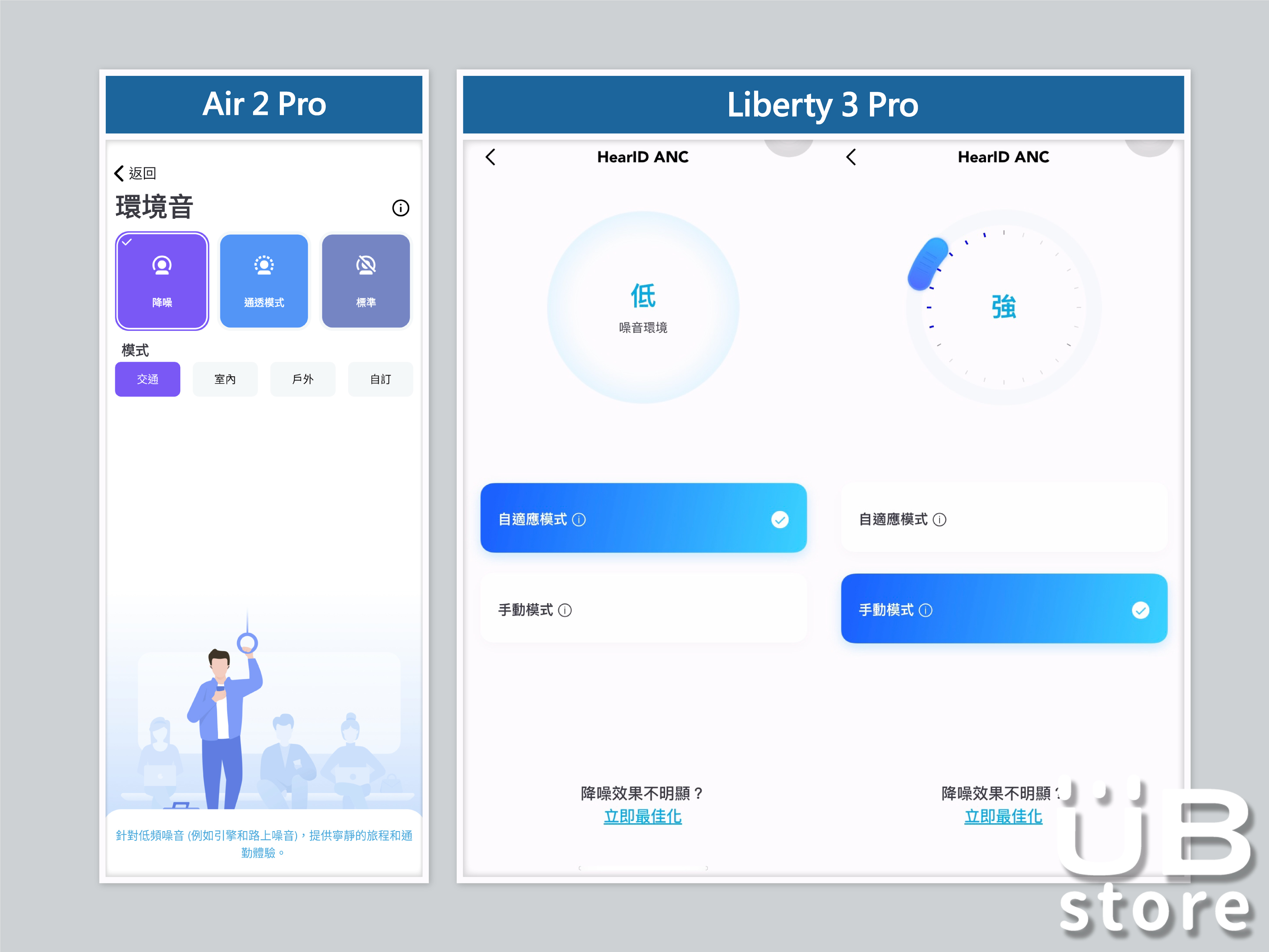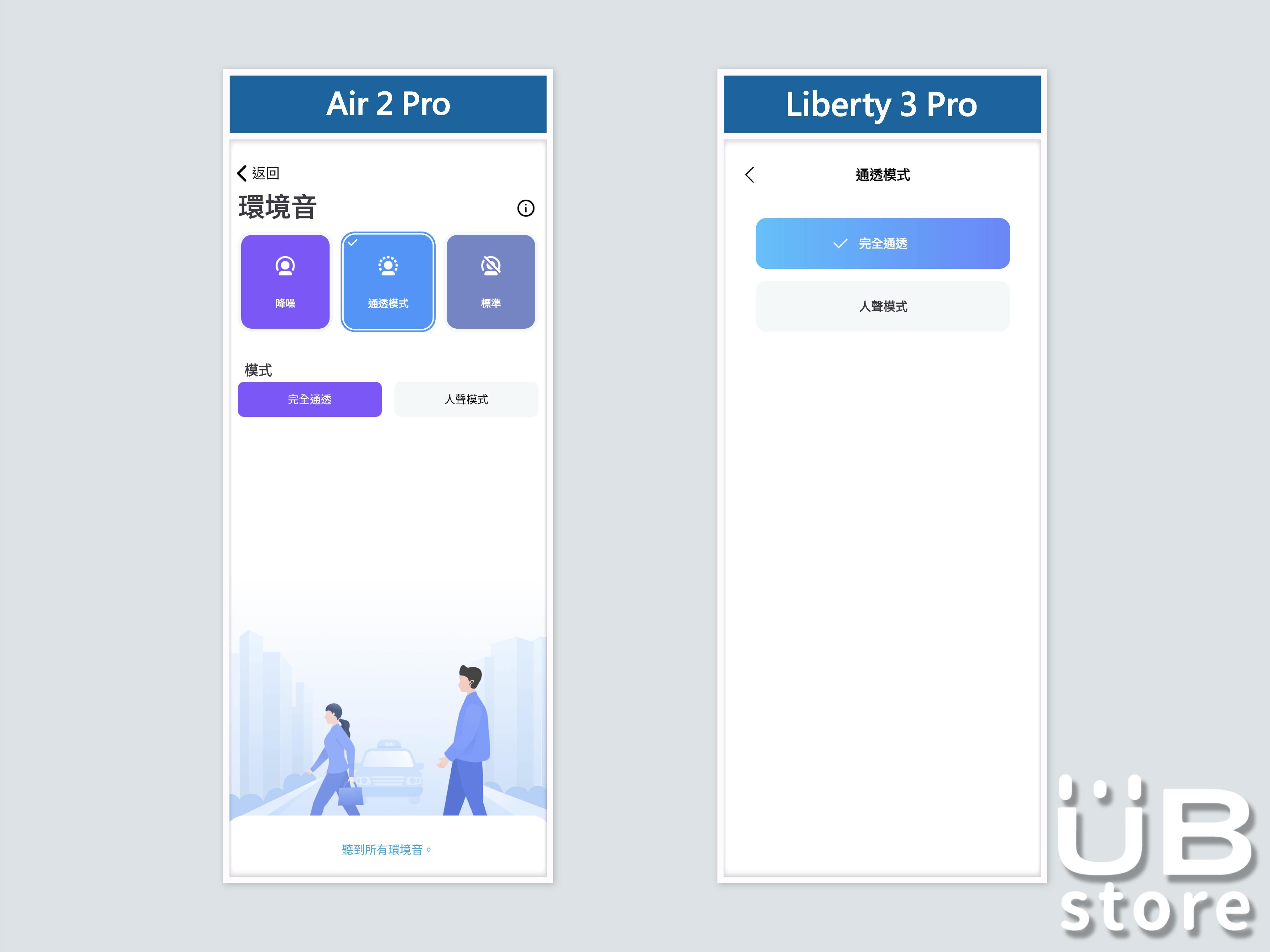 通透模式基本上跟 Air 2 Pro 沒有太大的差異,但是 Liberty 3 Pro 的通透模式外界聲音比較自然清晰,Air 2 Pro 會有一種隔層紗的感覺,比較沒有像 Liberty 3 Pro 那麼清楚。