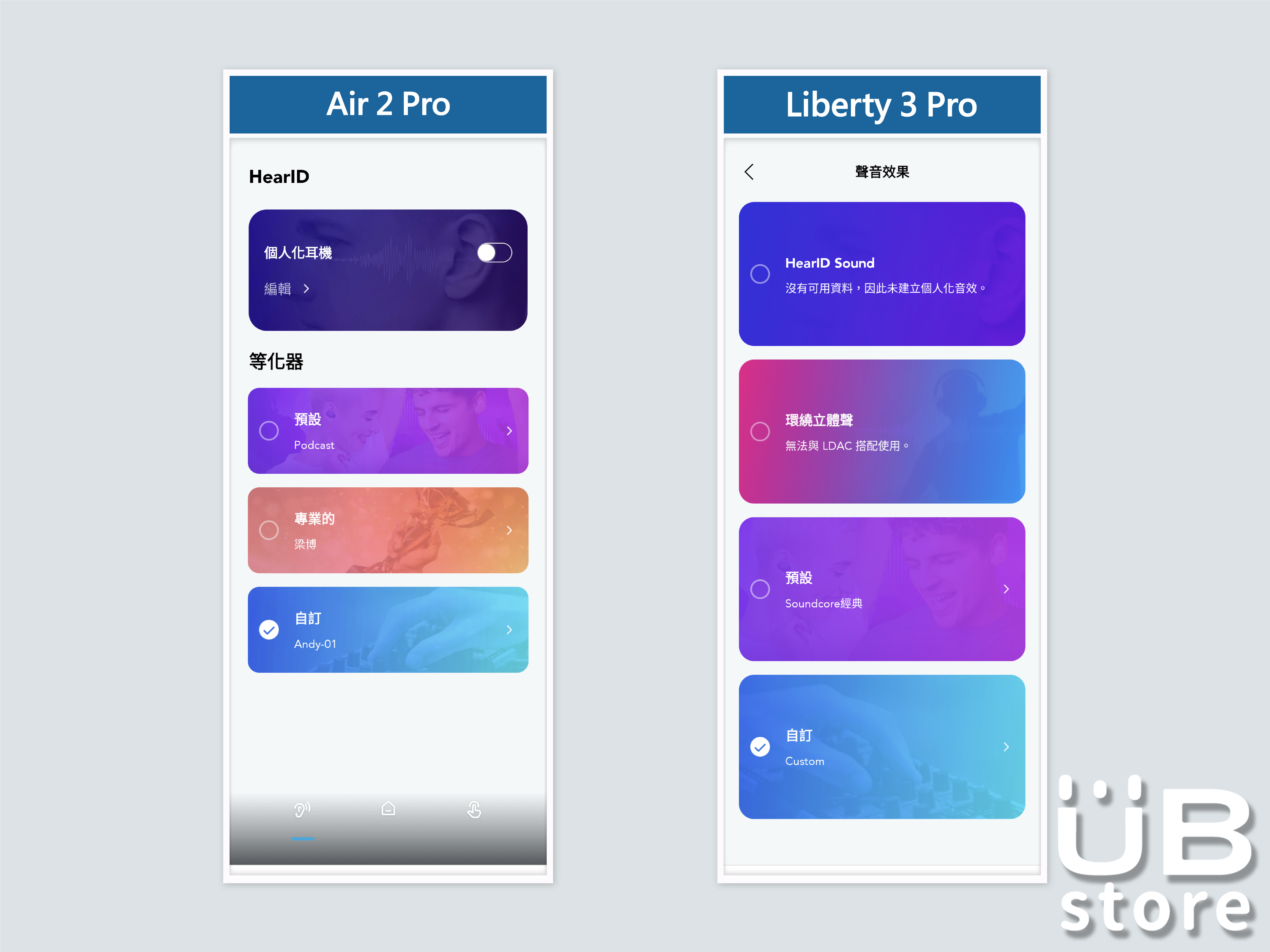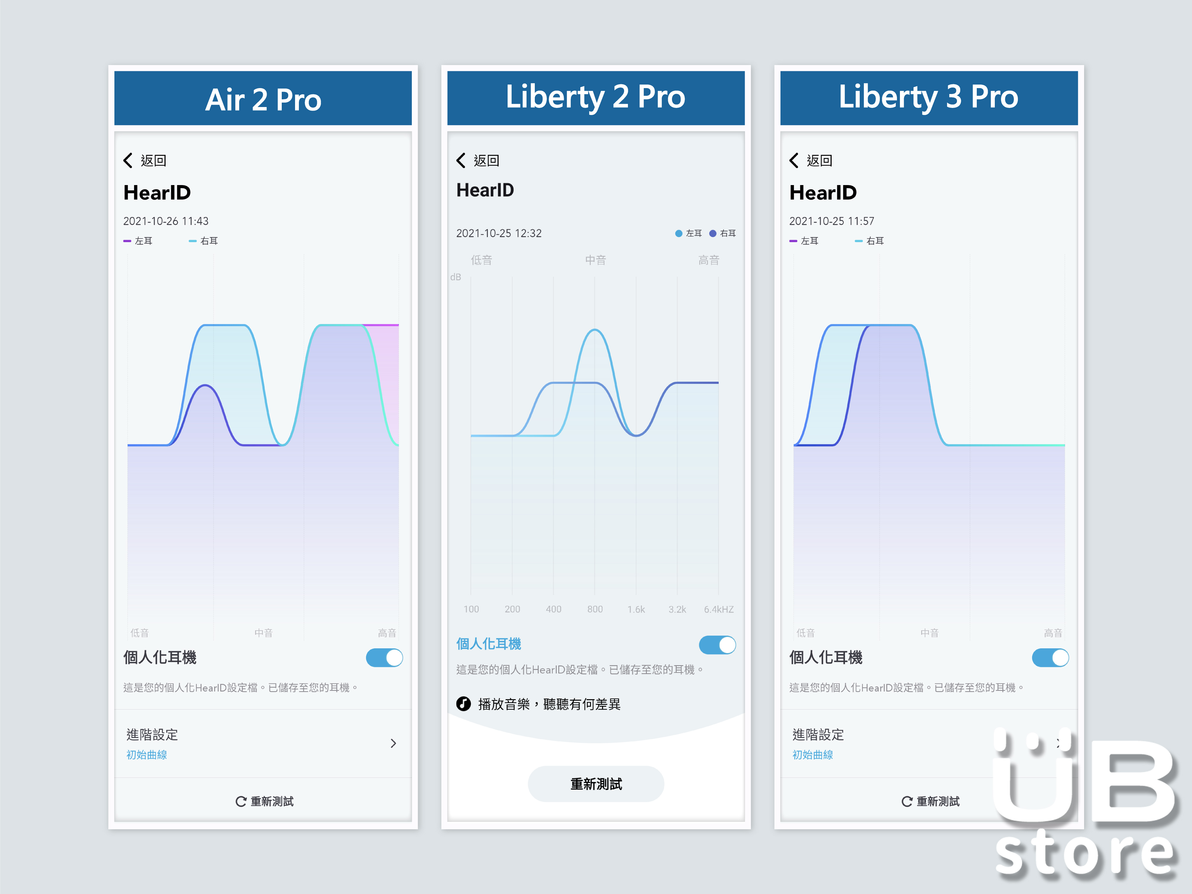 前面有提到「HearID 聽聞辨識」功能,分別在 Liberty 3 Pro、Liberty 2 Pro 和 Air 2 Pro 三款耳機所測試出來的結果都不一樣,聽感上也不同,我在猜想可能是因為耳機的發聲單體及聲音表現都有所不同的關係而有不一樣的結果,這邊放上我所測試出來的截圖給各位參考看看。