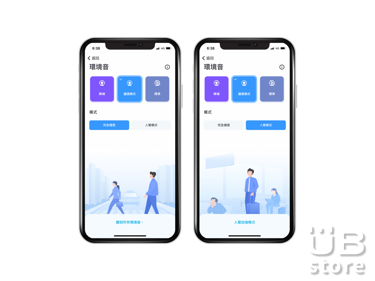 在通透(環境音)模式,一樣能透過APP調整通透情境-完全通透、人聲模式。