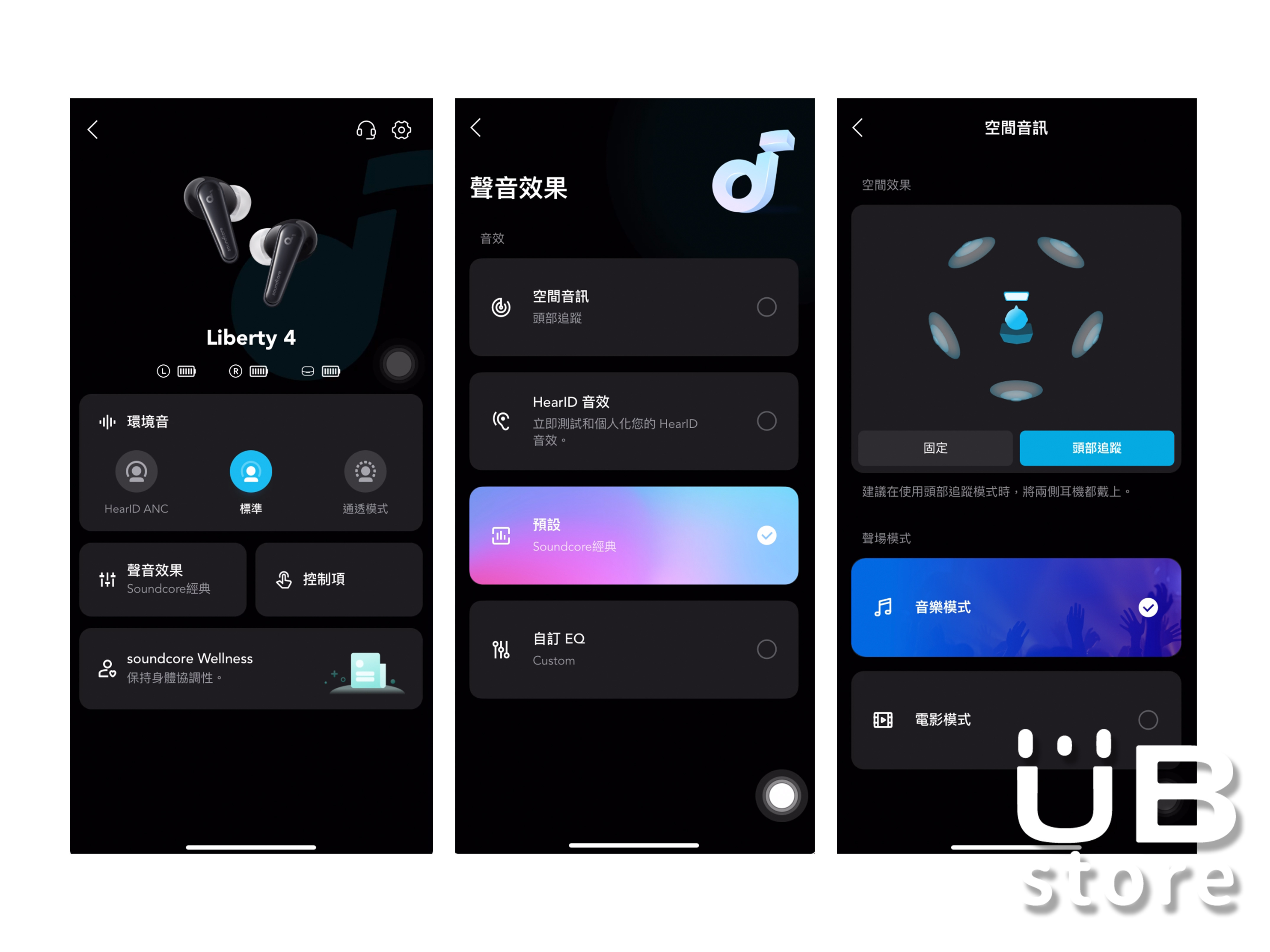 在聲音效果的區塊內可以開啟LDAC音頻編碼(Andriod 8.0以上手機支援),還有這次全新功能“空間音訊”,測試後使用”頭部追蹤“+“電影模式”來看電影,整個臨場感體驗真的讓人驚艷,而音樂模式感覺很適合聽Live Band。