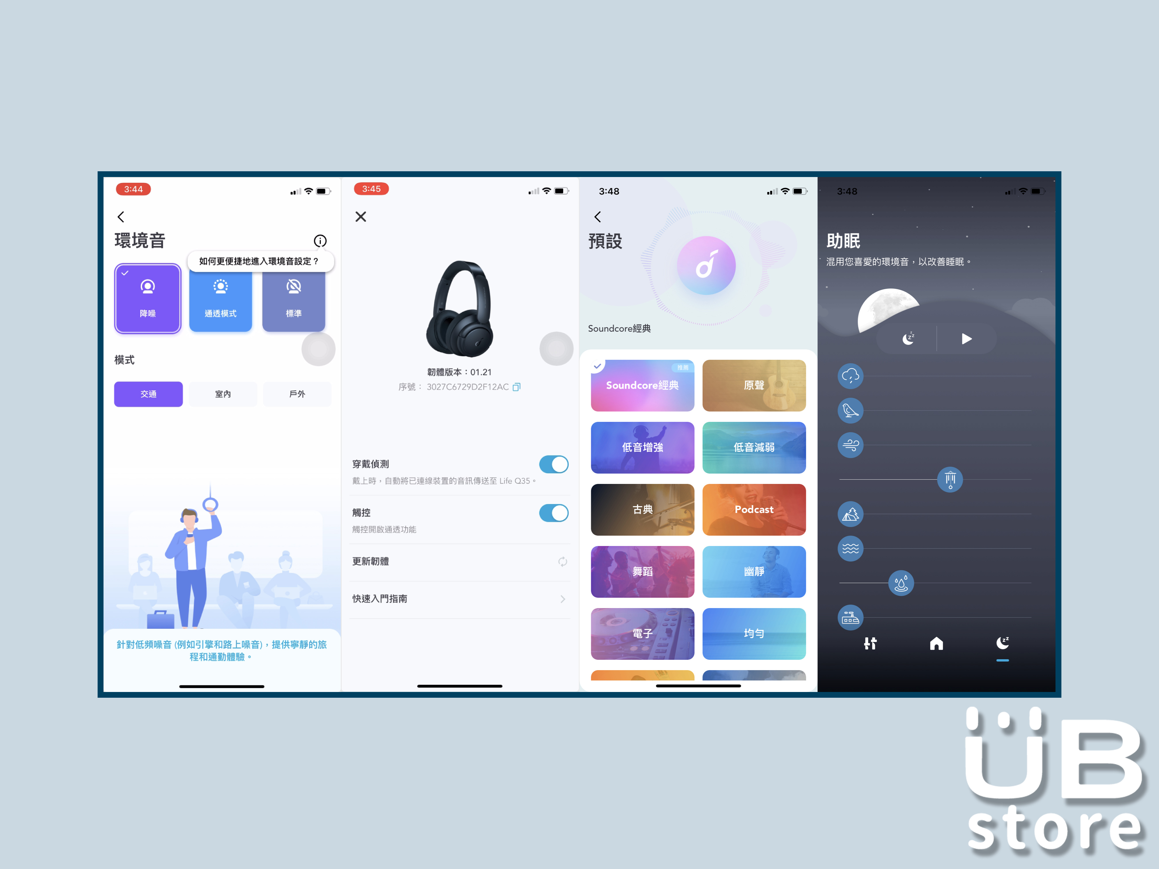 APP 也可調整「EQ等化器」,內建22種模式可以選擇,不喜歡內建的也可以自訂調音。以及「助眠」的白噪音功能,有11種聲音讓你自由搭配設定,最棒的是能在APP內更新韌體! 兩款耳機的小差別是,Q35 在APP裡還可以開啟「穿戴偵測」及「觸控開啟通透」功能。