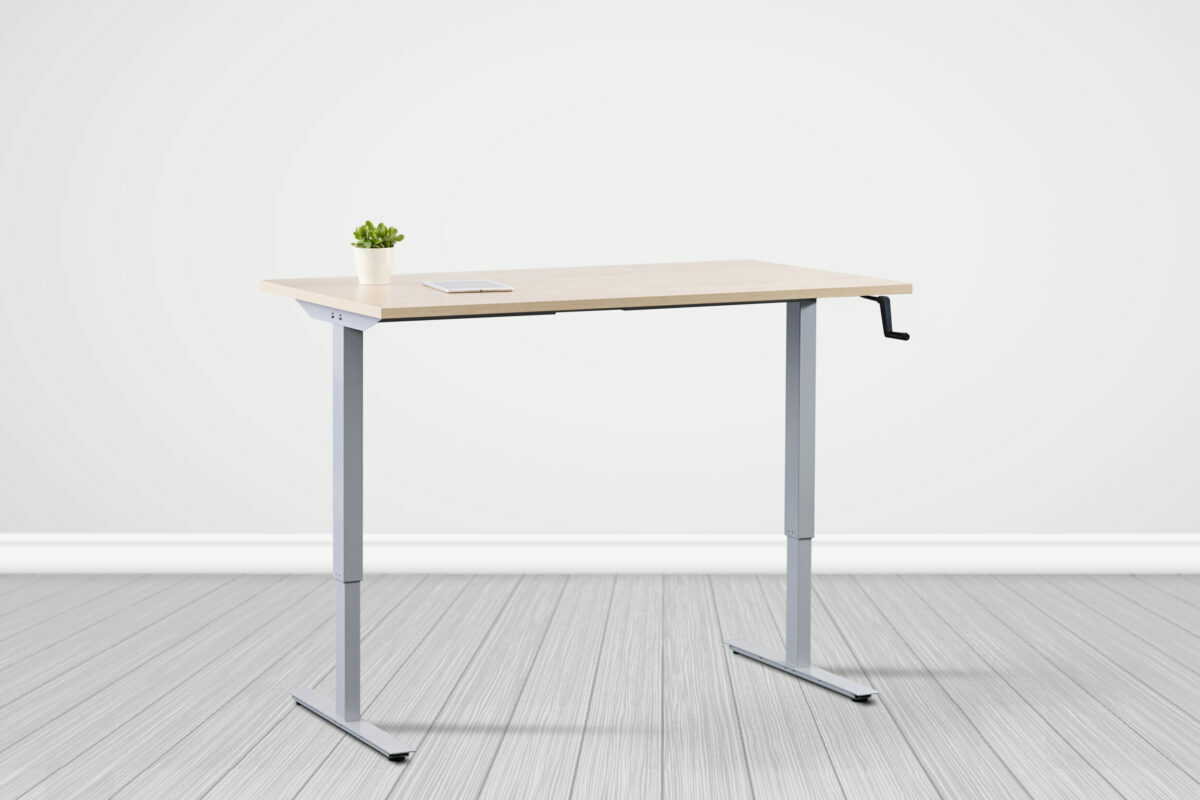 手轉式升降桌透過轉動桌板側邊的握把,帶動桌腳上升,通常為雙桌腳,承重能力優於氣壓式升降桌,因為不需要插電,無論擺放在何處都能升降,但手動的方式驅動升降效率低,升降速度最為緩慢。