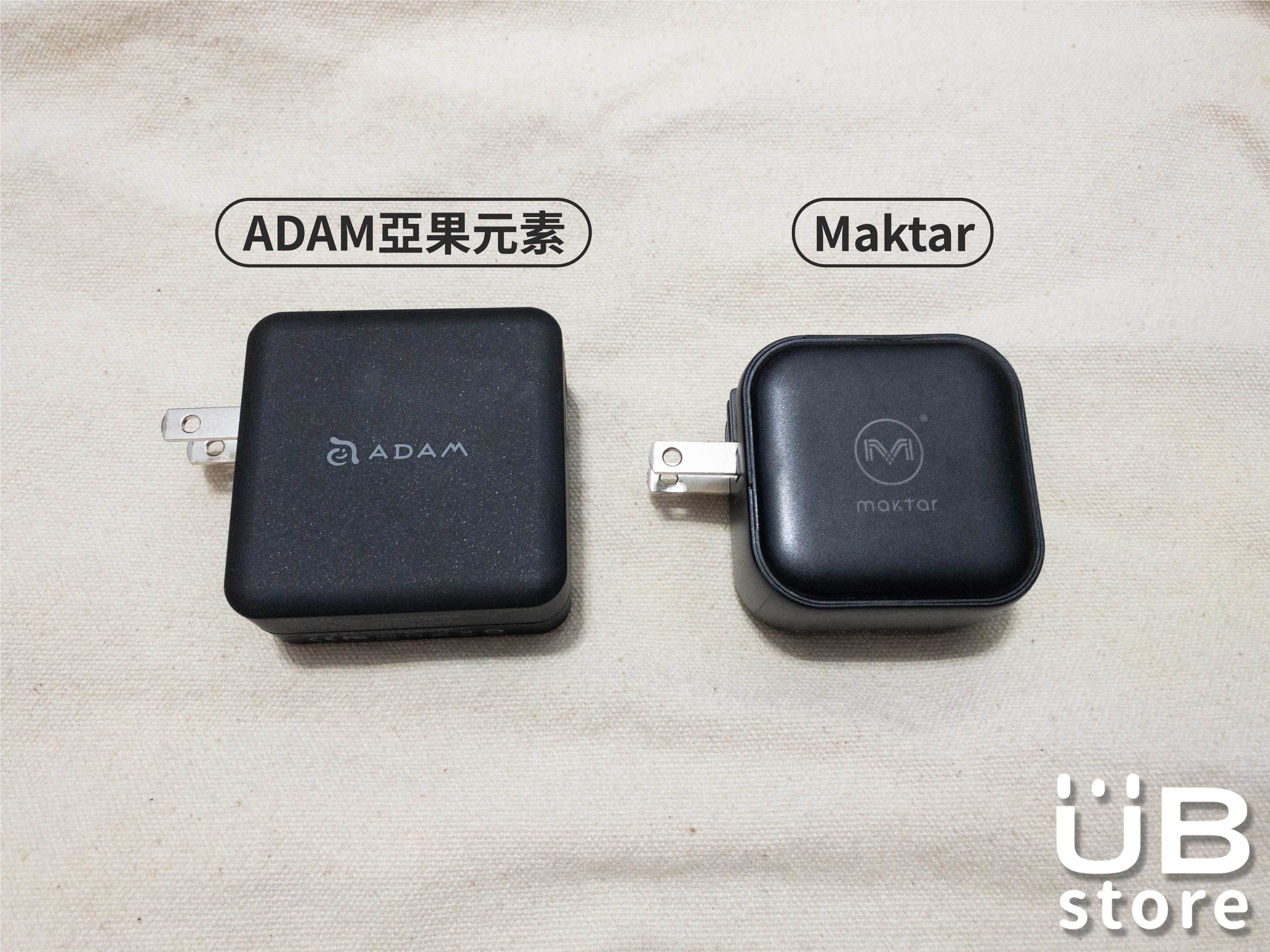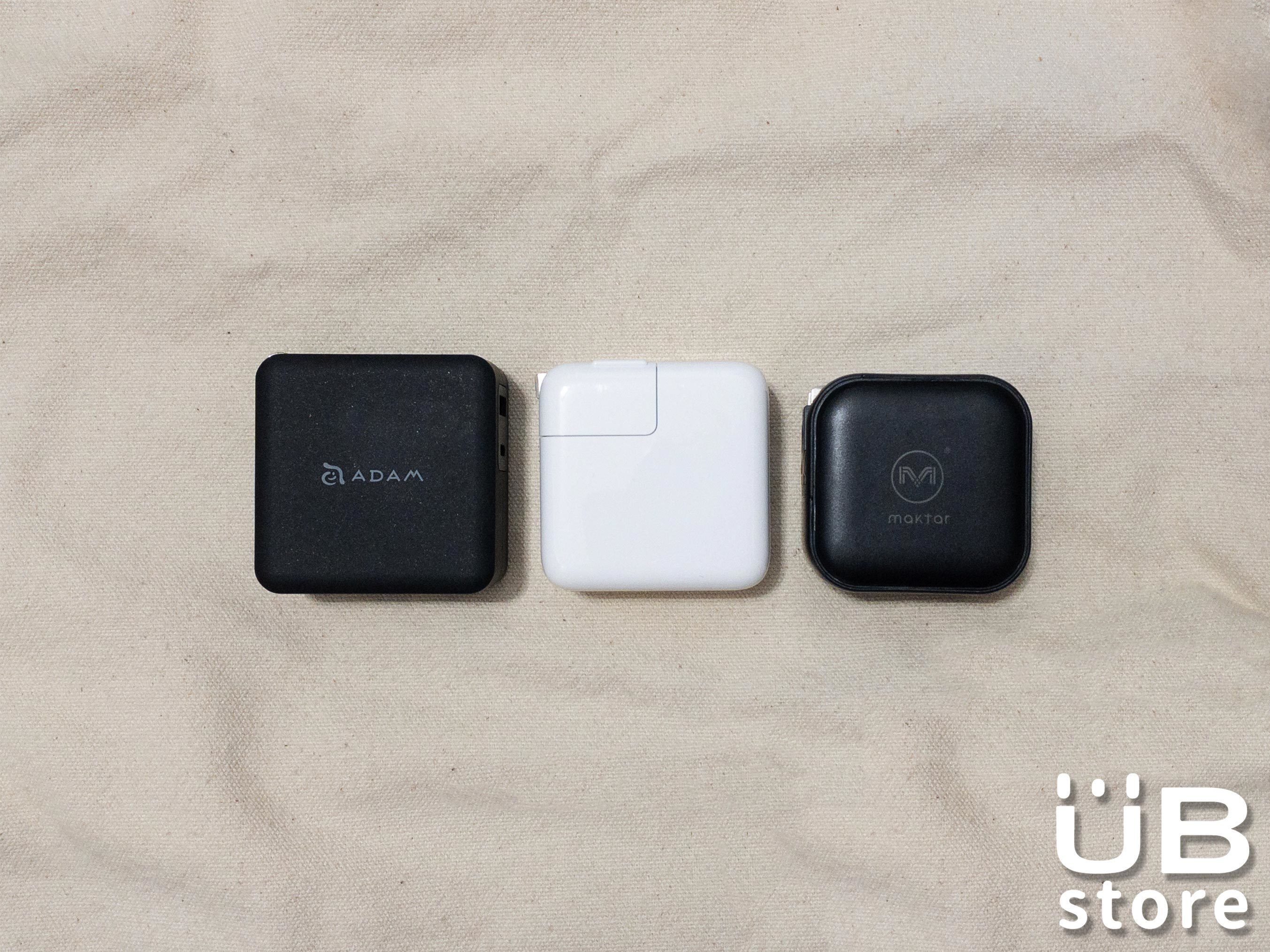 中間是Apple 30W單孔充電器,相較之下,使用GaN氮化鎵的Maktar三孔充電器,體積反而更小。