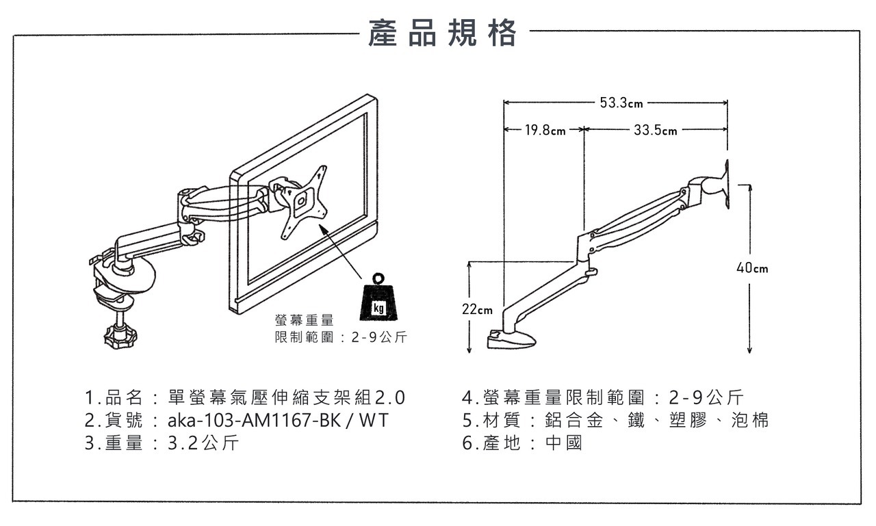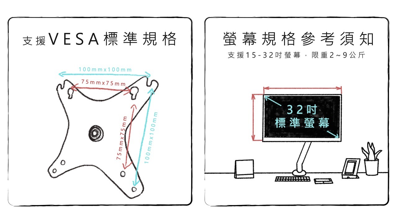 .螢幕可支援至32吋(適用2-9公斤內螢幕)