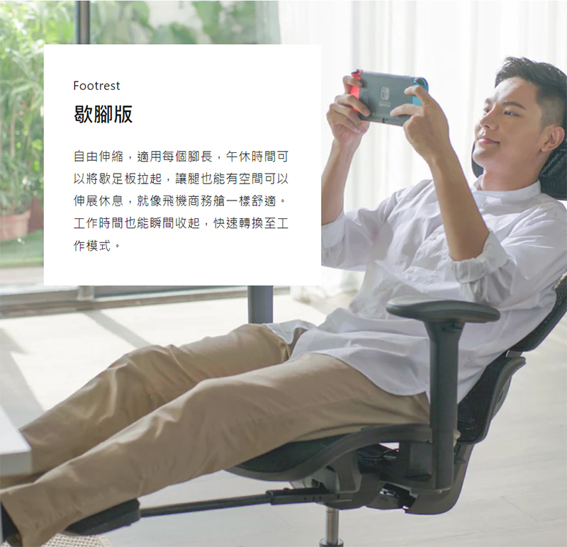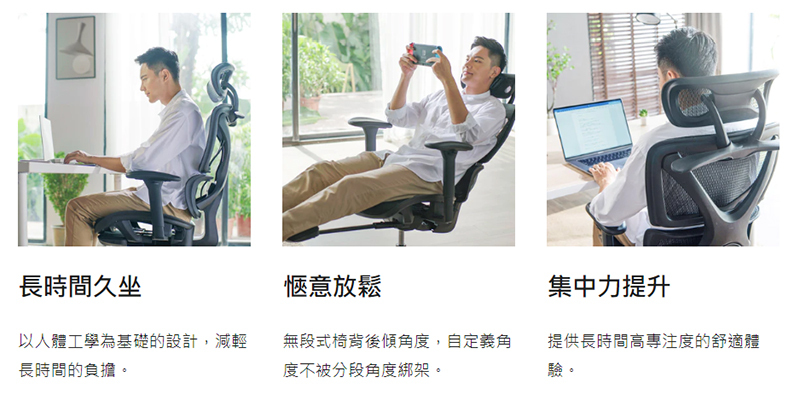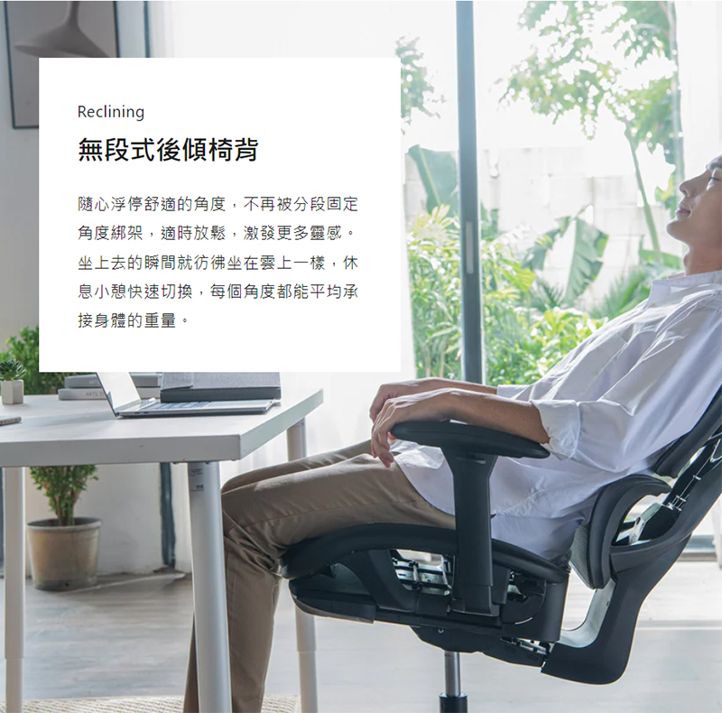 .無段式後傾椅背,每個角度承接重量