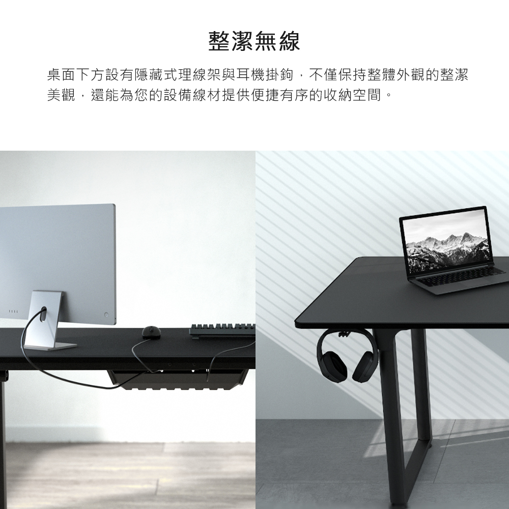 • 理線架和耳機掛鉤設計保持桌面整潔