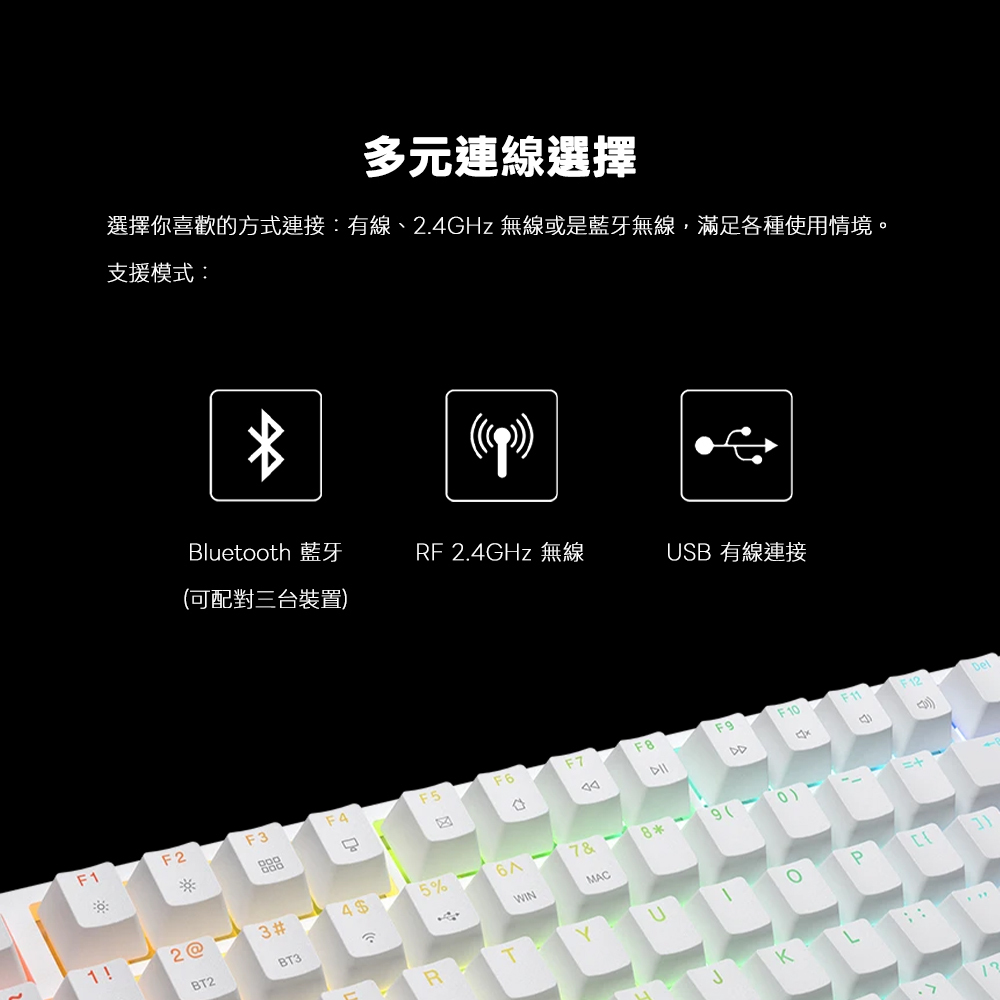 .連線模式支援:有線、2.4GHz 無線、Bluetooth 藍牙