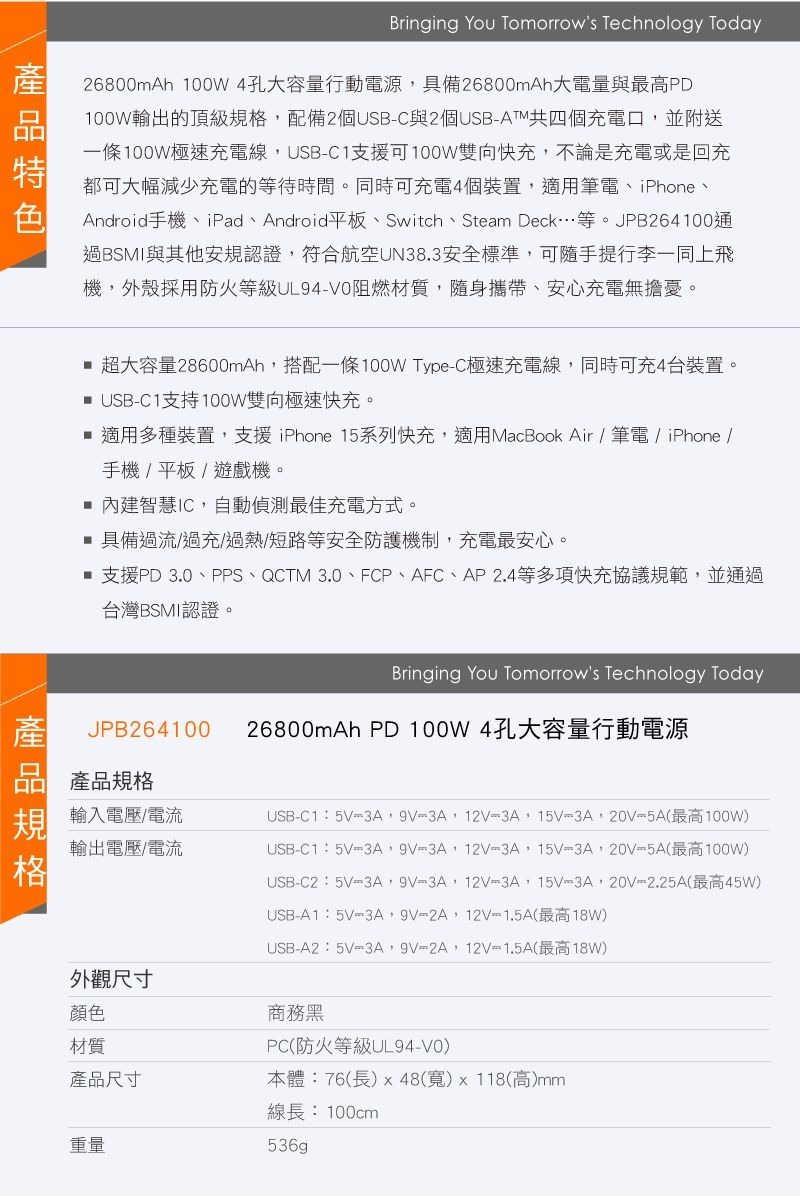 .USB-C1支持100W雙向極速快充