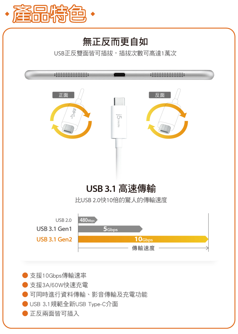 .可同時進行資料傳輸、影音傳輸及充電功能