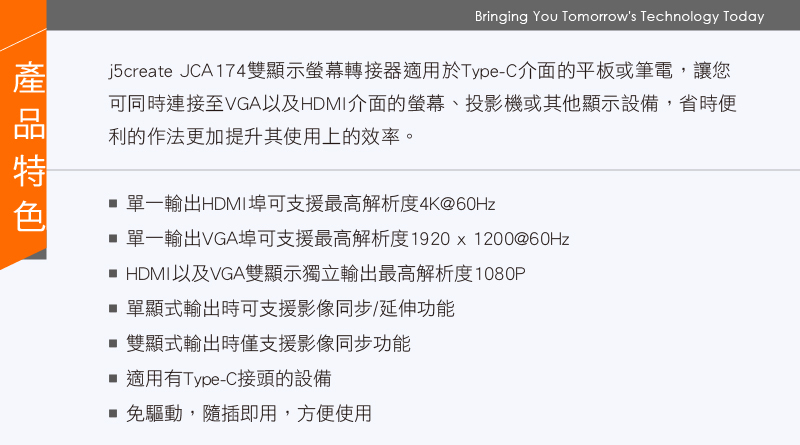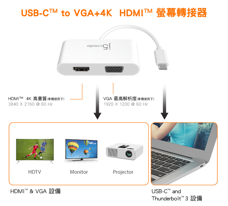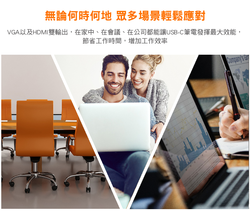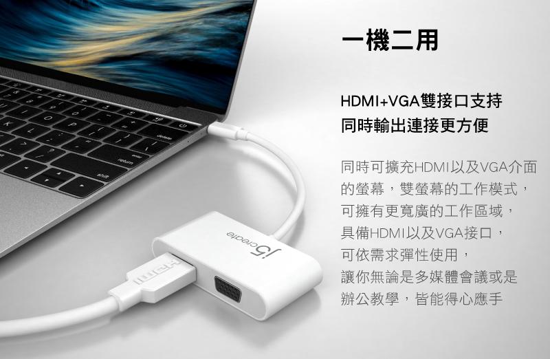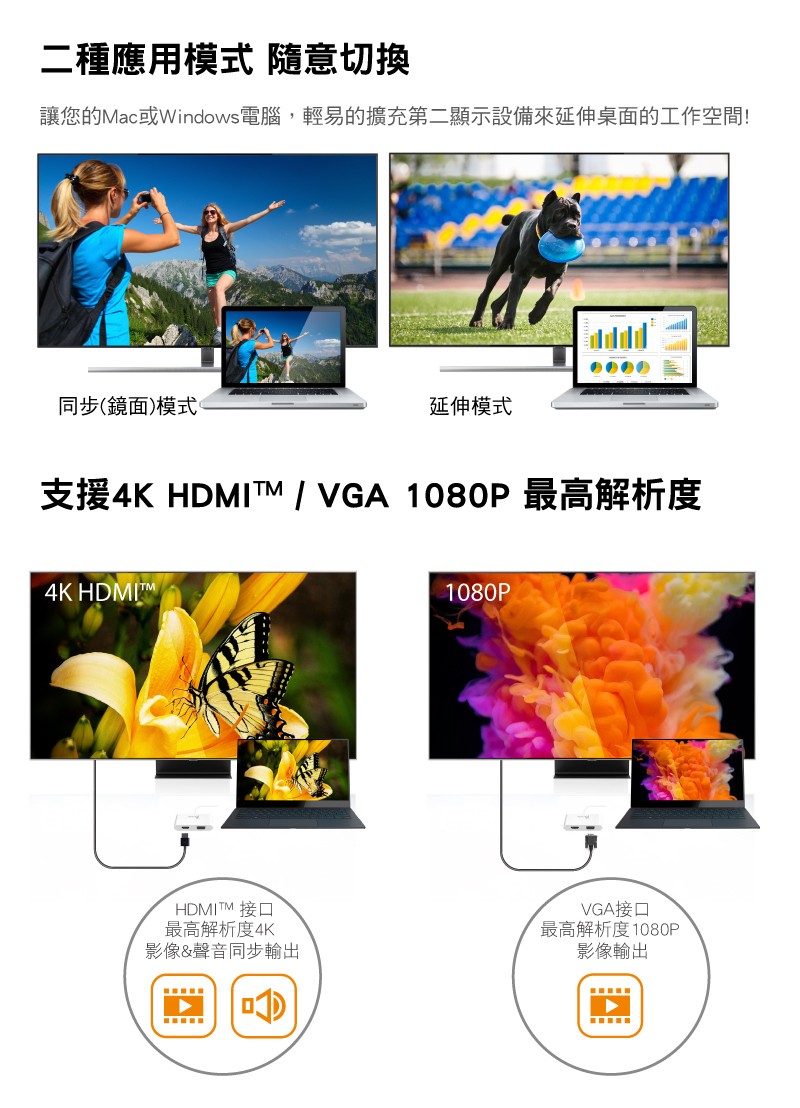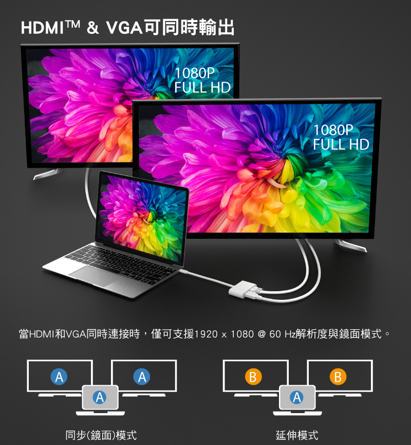 .可同時連接至VGA、HDMI介面螢幕和投影機等