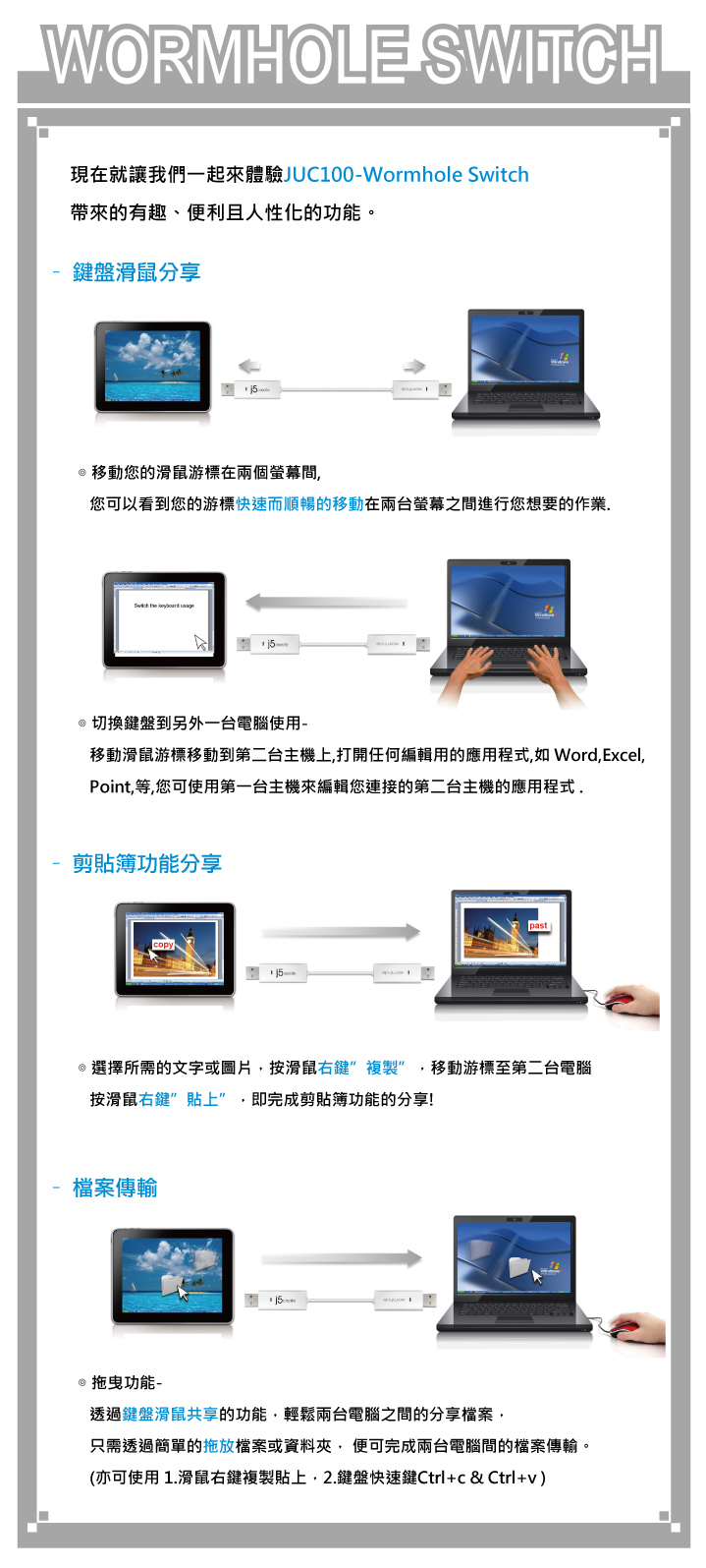 .一組鍵鼠可操作兩部電腦和檔案傳輸、及剪貼簿功能及充電功能