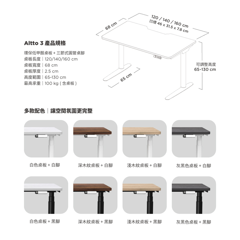 .三節式桌腳,提供65-130 cm更彈性的升降範圍