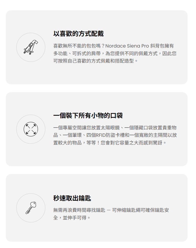 • 無懼電子竊賊:有了Nordace Siena Pro 斜背包,您的個人資料、數據、貴重物品永遠不會被盜竊。斜背包的RFID防盜卡槽智勝電子竊賊。
