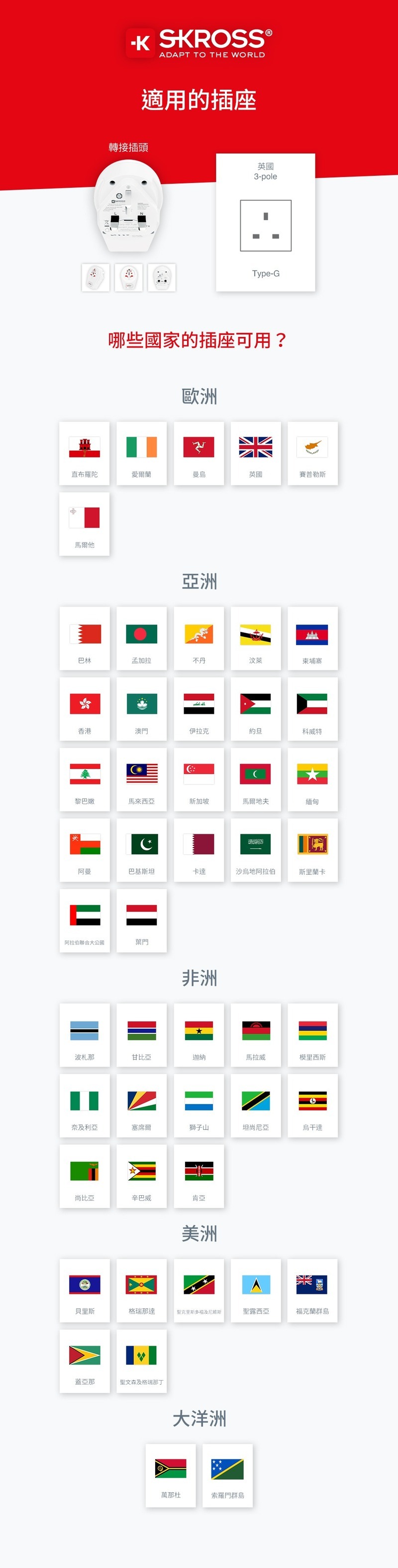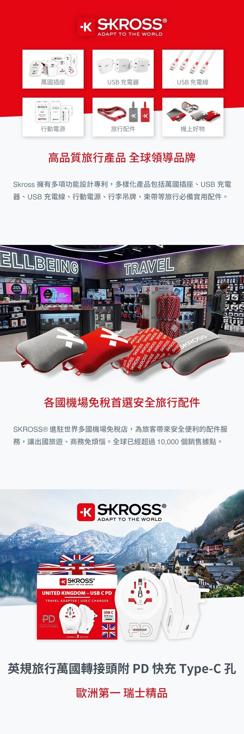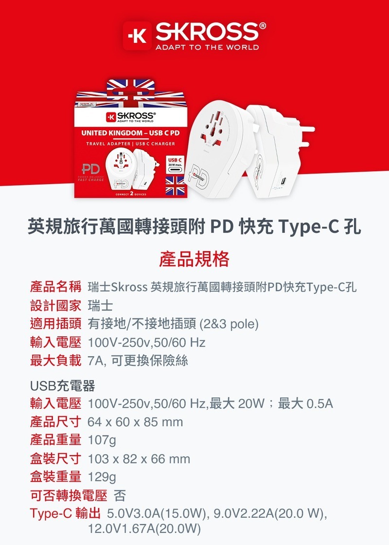 瑞士Skross 英規旅行萬國轉接頭附PD快充Type-C孔